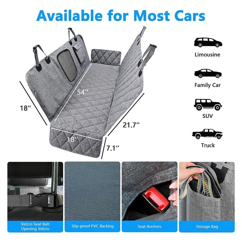 This rugged pet seat cover is made from 4 layers of fabrics: thick water-resistant oxford fabric; cotton layer; 100% waterproof polyester; and PVC non-slip soft rubber. Four layers of protection to keep your car safe from pet claws; stains; and liquids.